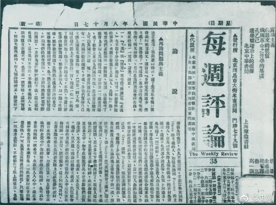 1919年8月17日,李大钊在《每周评论》第35期发表《再论问题与主义》一文,对胡适的观点作了严正的批驳。 (文字、图片来源:中央党史和文献研究院网站) |