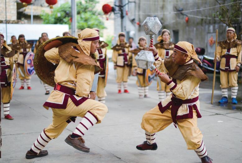 平潭藤牌操 平潭地处闽东沿海,港澳纵横,享有“千礁岛县”之称。为全省第一大岛,中国第五大岛,拥有丰富的海岛旅游资源和悠久的历史文化。风光壮丽的半洋石帆、海坛天神并称“平潭奇石双绝”,是平潭自然景观的象征。随处可见的以石头房为主体的聚居村落;时来运转、天长地久等民间小吃;文娱健身活动中的藤牌操舞;以及巧夺天工的贝雕技艺都形成了平潭独具特色的地域文化。此外,平潭“壳丘头文化”,源远流长。7000年以来,自晋中原土族为躲避战乱遁居于此,唐代开始在海坛岛上饲养军马,到宋代开始人丁兴旺,元时即达40000户之众。壳丘头文化遗址是福建省迄今发现最早的新石器时代。被誉为福建文明的摇篮,人类海洋文明的晨曦。 |