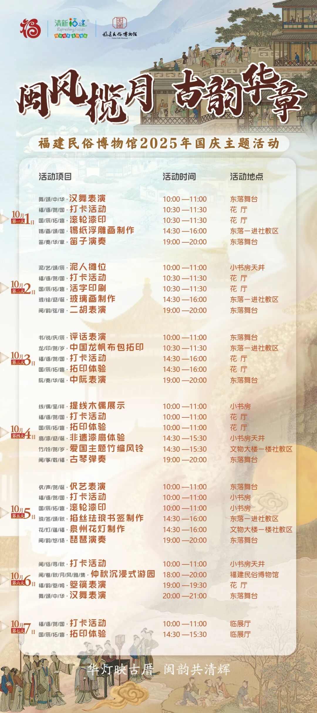 为热烈庆祝中华人民共和国成立76周年,国庆假期首日,福建民俗博物馆“闽风揽月 古韵华章”国庆主题活动正式启幕!以“红色传承+民俗体验”为核心脉络,我馆通过主题展览、互动社教、舞台演出三大板块,将红色记忆、传统民俗与手工技艺深度融合,为到场的市民游客奉上了一场兼具思想性与观赏性的文化大餐。 览红色印记 品民俗风华 国庆期间,民俗馆两大展览形成“红色记忆”与“民俗生活”的双轴呈现,为大家搭建起触摸历史、感知文化的桥梁。 由我馆联合闽东革命纪念馆、宁德市博物馆(福建省闽东畲族博物馆)、宁德市文化遗产保护中心共同推出的“红星照耀闽东——中国工农红军北上抗日先遣队闽东战斗历程图片展”,以近百幅珍贵历史图片与文献资料为载体,通过“挥师东进 ‘八一’亮剑”“攻克罗源 转战闽东”“赤溪会师 轻取穆阳”“挥别闽东 星火相传”四个篇章,生动再现了革命先辈在艰苦环境中坚守理想、奋勇抗争的峥嵘岁月。黑白影像里的战士身影、文字记载中的斗争精神,为国庆佳节赋予了厚重的红色底蕴,不少家长带着孩子驻足展板前,聆听革命故事,在回望历史中传承红色基因。 常设展览“润物细无声——二十四节气里的闽式生活展”则从生活美学维度,展现福建文化的独特魅力。以中国传统二十四节气为时间线索,展览将闽地特有的农事习俗、饮食文化、节庆礼仪一一融入立春的“迎春纳福”仪式、夏至的“凉食避暑”传统、冬至的“搓丸祭祖”习俗……大家在展厅内跟随节气脉络漫步,仿佛置身于一幅充满烟火气的闽式生活长卷,深刻感受中华优秀传统文化“润物细无声”的传承力量。 手作传技艺 传统焕新颜 如果说主题展览是历史与文化的“静态呈现”,那么馆内花厅的社教体验区,就是传统技艺与节日祝福的“动态表达”。国庆首日,这里成为亲子家庭与年轻群体的“打卡胜地”,特色手工活动持续引发参与热潮。 “国辰拓趣·滚轮漆印”活动中,工作人员现场演示传统拓印技艺的操作要点,参与者手持特制滚轮,蘸取环保漆料,将“福”字等吉祥图案拓印在宣纸之上。“以前只在书本里见过拓印,今天亲手做才知道,力度和角度都有讲究。”一位参与活动的小学生拿着自己的作品,难掩兴奋。这项活动让古老的拓印技艺走出文物典籍,在亲手操作中让大家触摸到传统工艺的温度。 “福语贺国·打卡活动”同样人气高涨。大家排队领取国庆主题徽章、明信片、书签等文创礼品,还有《福建文旅手绘导览图》免费发放。“导览图上标注了福建各地的民俗博物馆和文化景点,接下来的假期打算照着图去走走。”一位来自浙江的游客说,小小的导览图让他对八闽文化产生了更深的探索兴趣。 “锡画颂国·锡纸浮雕画制作”活动更具巧思,将锡纸浮雕工艺与国庆主题创新结合。柔软的锡纸在大家指尖经过捏、压、折、贴等工序,逐渐化为“玉兔”“中秋月”“迎中秋 庆国庆”等兼具立体感与艺术感的作品。不少家庭合作完成创作,把对祖国的祝福与对团圆的期盼融入指尖,让非遗技艺在创新表达中焕发生机。 汉舞展雅韵 笛声诉情怀 韵笛馆内舞台区同样热闹非凡,“舞颂中华·汉舞表演”“笛奏华章·笛子演奏”两场特色展演昼夜交替、轮番上演,为古厝注入灵动的节日气息,吸引大批观众驻足观赏。 此外,第十四届鼓浪屿钢琴艺术周的重要公共艺术项目——“共享钢琴计划”在国庆期间走进福建民俗博物馆,一架亮漆钢琴静立古厝之中,演奏家指尖轻触琴键,优雅琴声便在黛瓦飞檐间回荡,时而如闽江潮起温柔婉转,时而似鼓山松风清亮明快,古典乐韵与百年厝落的古韵巧妙交融,引得过往观众纷纷驻足,或举机记录瞬间,或闭目聆听沉醉,为这场国庆文化盛宴增添了一抹浪漫而厚重的艺术色彩。 国庆首日的热闹氛围只是开端,接下来的假期里,“闽风揽月 古韵华章”国庆主题活动将持续精彩放送,邀您共度文化假期。 国庆、中秋双节活动安排 |