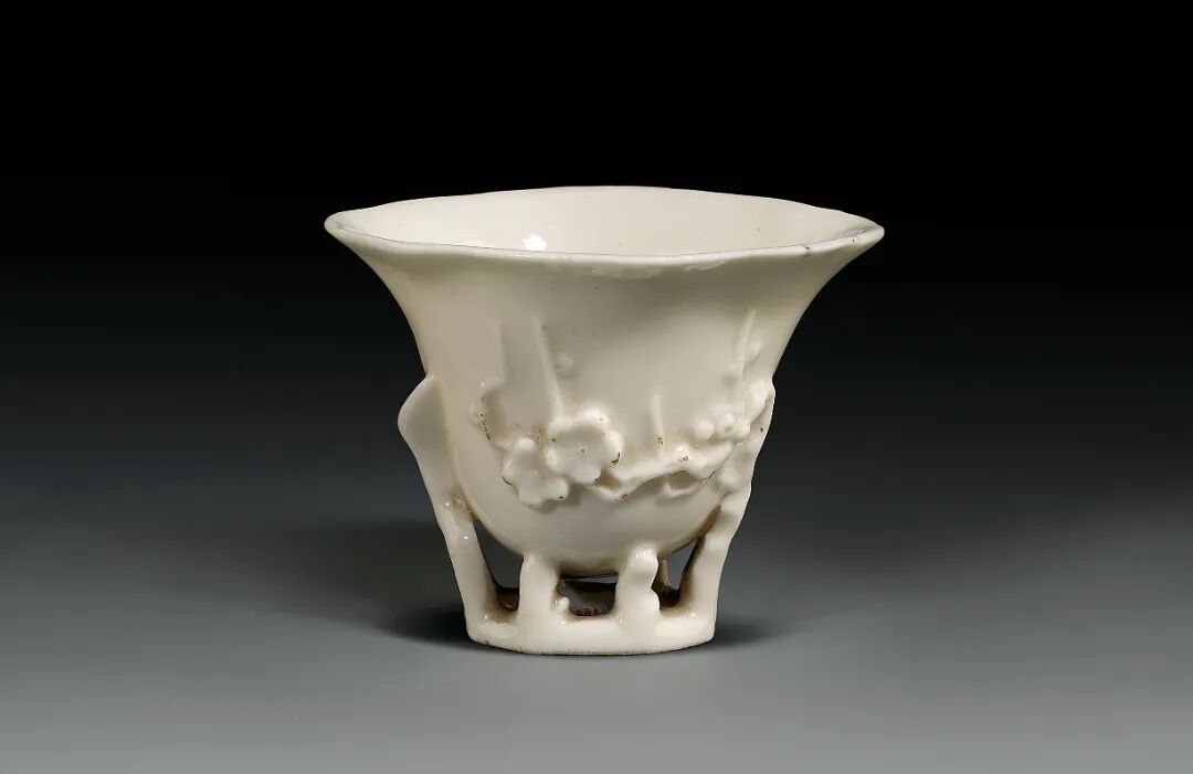 小寒时节,寒梅凌霜绽放,成为冬日里最具风骨的景致,而福建民俗博物馆馆藏的这件清代德化窑梅花杯,正是以瓷为媒定格了这份小寒诗意。杯身采用德化窑标志性的“中国白”瓷料,莹白如凝脂,通过堆塑技法雕琢出梅枝虬曲、梅蕾初绽的模样,枝桠苍劲、花瓣清隽,将小寒梅景的疏朗与傲骨具象呈现,敞口收腰的杯型搭配仿梅根的镂空杯足,虚实相生间尽显闽地瓷塑工艺的精妙。 |