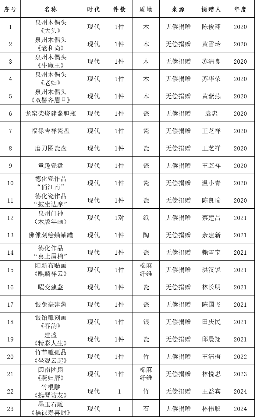 根据《中华人民共和国公益事业捐赠法》及《福建民俗博物馆社会捐赠管理办法(修订)》等相关规定,现将我馆2020-2025年度接受社会各界无偿捐赠藏品共计二十三件(套),予以公示。
