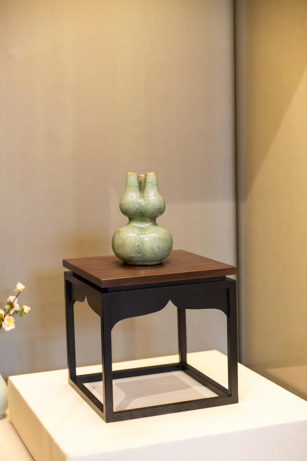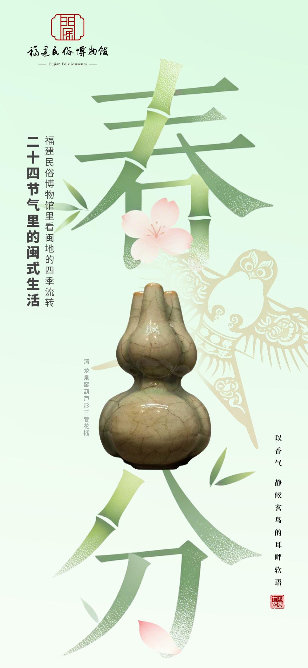 一候|时光的刻度 春分者,阴阳相半也——昼夜均而寒暑平,故曰“分”。每年公历3月19日-22日,太阳行至黄经零度,春天便走到了最平衡的刻度。 这一天,白昼与黑夜等长,寒意与暖意相持。闽地的山川间,桃花灼灼,柳色青青,万物皆在“刚好”的状态里悄然生长。这是春天最从容的时刻——不急不缓,不偏不倚,恰如人生最好的境界。 一物|岁月的信物 这件葫芦瓶静立在那儿,釉色莹润苍翠,如春日新染的柳色。三瓣葫芦合为一体,造型精巧别致——葫芦谐音“福禄”,三管并立,寓意“多福多禄”。